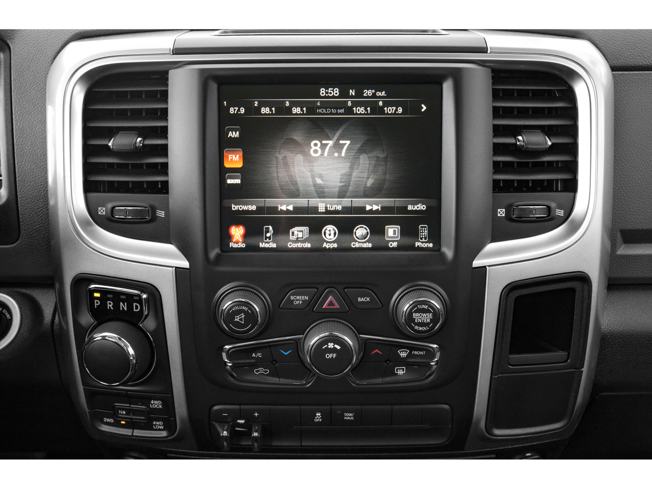 3.21 Rear Axle Ratio, 4-Wheel Disc Brakes, 40/20/40 Split Bench Seat, 6 Speakers, ABS Brakes, Air Conditioning, Alloy Wheels, AM/FM radio: SiriusXM, Black Exterior Mirrors, Brake Assist, Bumpers: chrome, Center Hub, Compass, Delay-off Headlights, Driver door bin, Dual Front Impact Airbags, Dual Front Side Impact Airbags, Electronic Stability Control, Exterior Mirrors w/Heating Element, Front Anti-Roll Bar, Front Armrest w/3 Cupholders, Front Center Armrest w/Storage, Front reading lights, Front wheel independent suspension, Fully Automatic Headlights, GPS Antenna Input, Heated door mirrors, Illuminated Entry, Integrated Voice Command w/Bluetooth®, Low Tire Pressure Warning, Manufacturer's Statement of Origin, Occupant sensing airbag, Outside temperature display, Overhead airbag, Overhead console, Panic alarm, ParkView Rear Back-Up Camera, Passenger door bin, Passenger vanity mirror, Power Door Mirrors, Power Steering, Power Windows, Radio data system, Rear Anti-Roll Bar, Rear Floor Mats, Rear seat center armrest, Rear Step Bumper, Remote Keyless Entry, Remote USB Port - Charge Only, Speed control, Storage Tray, Tachometer, Tilt steering wheel, Traction Control, Trip computer, Variably intermittent wipers, Voltmeter.