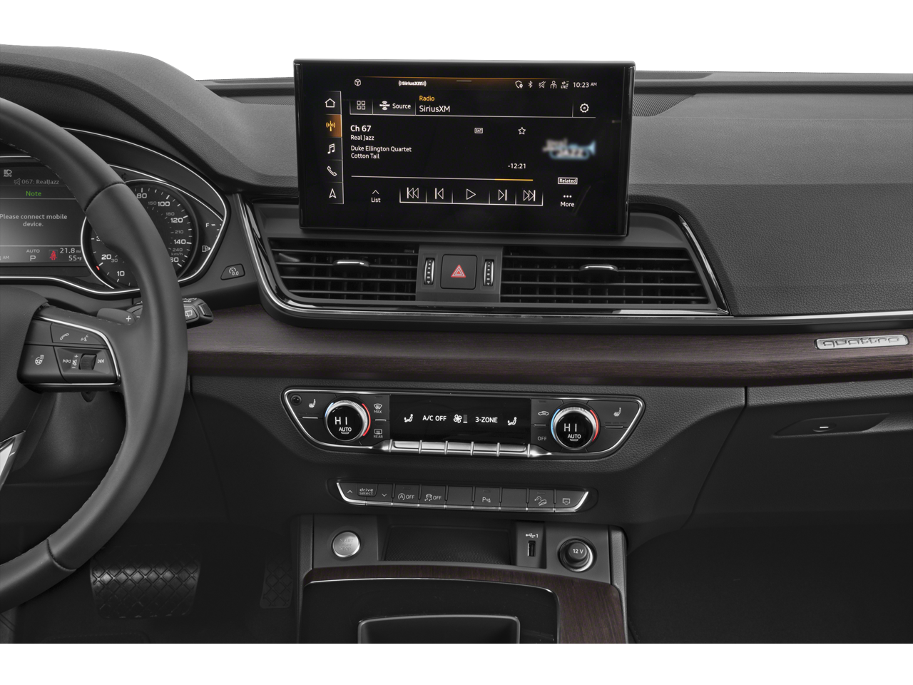 Leather, 10 Speakers, 4-Wheel Disc Brakes, 5.302 Axle Ratio, ABS Brakes, Air Conditioning, Alloy Wheels, AM/FM radio, Auto High-Beam Headlights, Auto-dimming Rear-View mirror, Automatic temperature control, Brake Assist, Bumpers: body-color, Compass, Delay-off Headlights, Driver door bin, Driver vanity mirror, Dual Front Impact Airbags, Dual Front Side Impact Airbags, Electronic Stability Control, Emergency communication system: Audi connect CARE, Exterior Parking Camera Rear, Four wheel independent suspension, Front Anti-Roll Bar, Front Bucket Seats, Front Center Armrest, Front Dual Zone A/C, Front Fog Lights, Front reading lights, Garage door transmitter: HomeLink, Genuine wood console insert, Genuine wood dashboard insert, Genuine wood door panel insert, Heated 8-Way Power Front Bucket Seats, Heated door mirrors, Heated Front Bucket Seats, Heated steering wheel, Illuminated Entry, Leather Seating Surfaces, Leather Shift Knob, Leather steering wheel, Low Tire Pressure Warning, Occupant sensing airbag, Outside temperature display, Overhead airbag, Overhead console, Panic alarm, Passenger door bin, Passenger vanity mirror, Power Door Mirrors, Power Driver Seat, Power Liftgate, Power Passenger Seat, Power Steering, Power Windows, Radio data system, Radio: Audi Sound System, Rain Sensing Wipers, Rear Air Conditioning, Rear Anti-Roll Bar, Rear fog lights, Rear reading lights, Rear seat center armrest, Rear window defroster, Rear window wiper, Remote Keyless Entry, Roof Rack, Security system, Speed control, Speed-sensing steering, Speed-Sensitive Wipers, Split Folding Rear Seat, Spoiler, Steering Wheel Mounted Audio Controls, Tachometer, Telescoping steering wheel, Tilt steering wheel, Traction Control, Trip computer, Turn signal indicator mirrors, Variably intermittent wipers, Wheels: 18 5-Arm-Turbine Design, Leather.