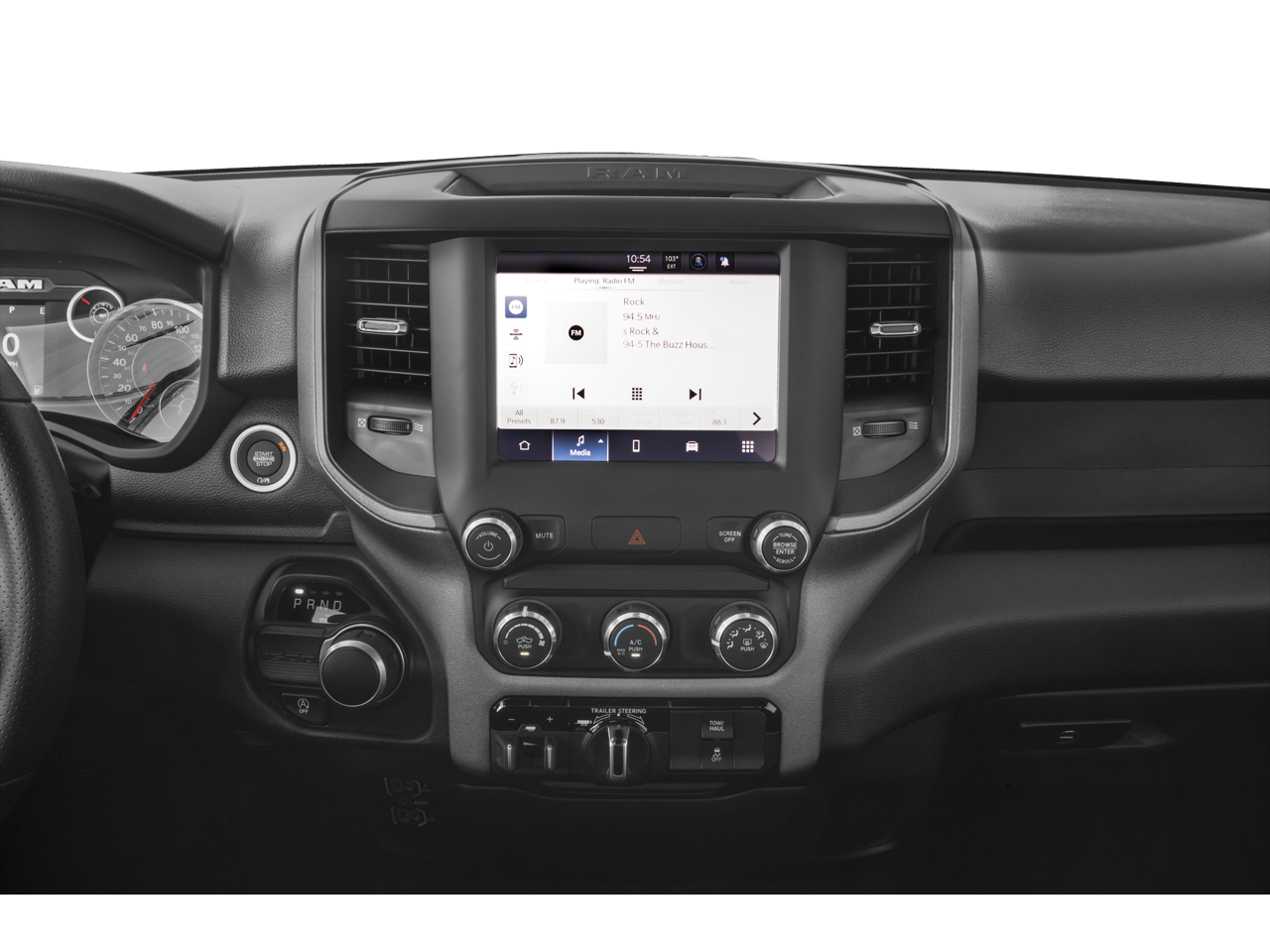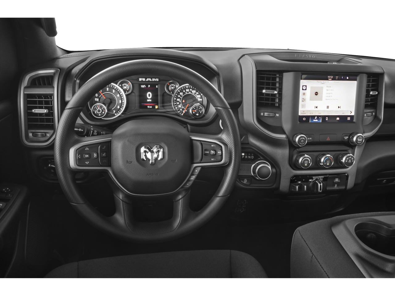 3.21 Rear Axle Ratio, 3.55 Rear Axle Ratio, 4 Way Front Headrests, 4-Wheel Disc Brakes, 40/20/40 Split Bench Seat, 48V Belt Starter Generator, 4G LTE Wi-Fi Hot Spot, 6 Speakers, ABS Brakes, Air Conditioning, AM/FM radio, Apple CarPlay, Black Trailer Tow Power Mirrors, Bluetooth® Handsfree Phone & Audio, Brake Assist, Class IV Receiver Hitch, Compass, Connectivity - US/Canada, Delay-off Headlights, Driver door bin, Dual Front Impact Airbags, Dual Front Side Impact Airbags, Electronic Stability Control, Emergency communication system: RAM Connect, Exterior Mirrors Courtesy Lamps, Exterior Mirrors w/Heating Element, Exterior Mirrors w/Supplemental Signals, For Details, Visit DriveUconnect.com, For More Info, Call 800-643-2112, Front Anti-Roll Bar, Front Center Armrest, Front License Plate Bracket, Front reading lights, Front wheel independent suspension, Fully Automatic Headlights, Global Telematics Box Module (TBM), Google Android Auto, Heated door mirrors, Heavy Duty Vinyl 40/20/40 Split Bench Seat, Illuminated Entry, Low Tire Pressure Warning, Manual Adjust 4-Way Driver Seat, Manual Adjust 4-Way Front Passenger Seat, MOPAR Front & Rear Rubber Floor Mats, Occupant sensing airbag, Outside temperature display, Overhead airbag, Overhead console, Panic alarm, ParkView Rear Back-Up Camera, Passenger door bin, Passenger vanity mirror, Power Door Mirrors, Power Steering, Power Windows, Quick Order Package 27A Tradesman, Radio data system, Radio: Uconnect 3 w/5 Display, Radio: Uconnect 5 W w/8.4 Display, Rear Anti-Roll Bar, Rear Folding Seat, Rear Step Bumper, Remote Keyless Entry, SiriusXM Radio Service, SiriusXM Satellite Radio, Speed control, Tachometer, Telescoping steering wheel, Tilt steering wheel, Traction Control, Trailer Brake Control, Trailer Light Check, Trailer Reverse Steering Control, Trailer Tire Pressure Monitoring System, Trailer Tow Group, USB Host Flip, Variably intermittent wipers, Voltmeter, Wheels: 18 x 7.5 Steel Painted.